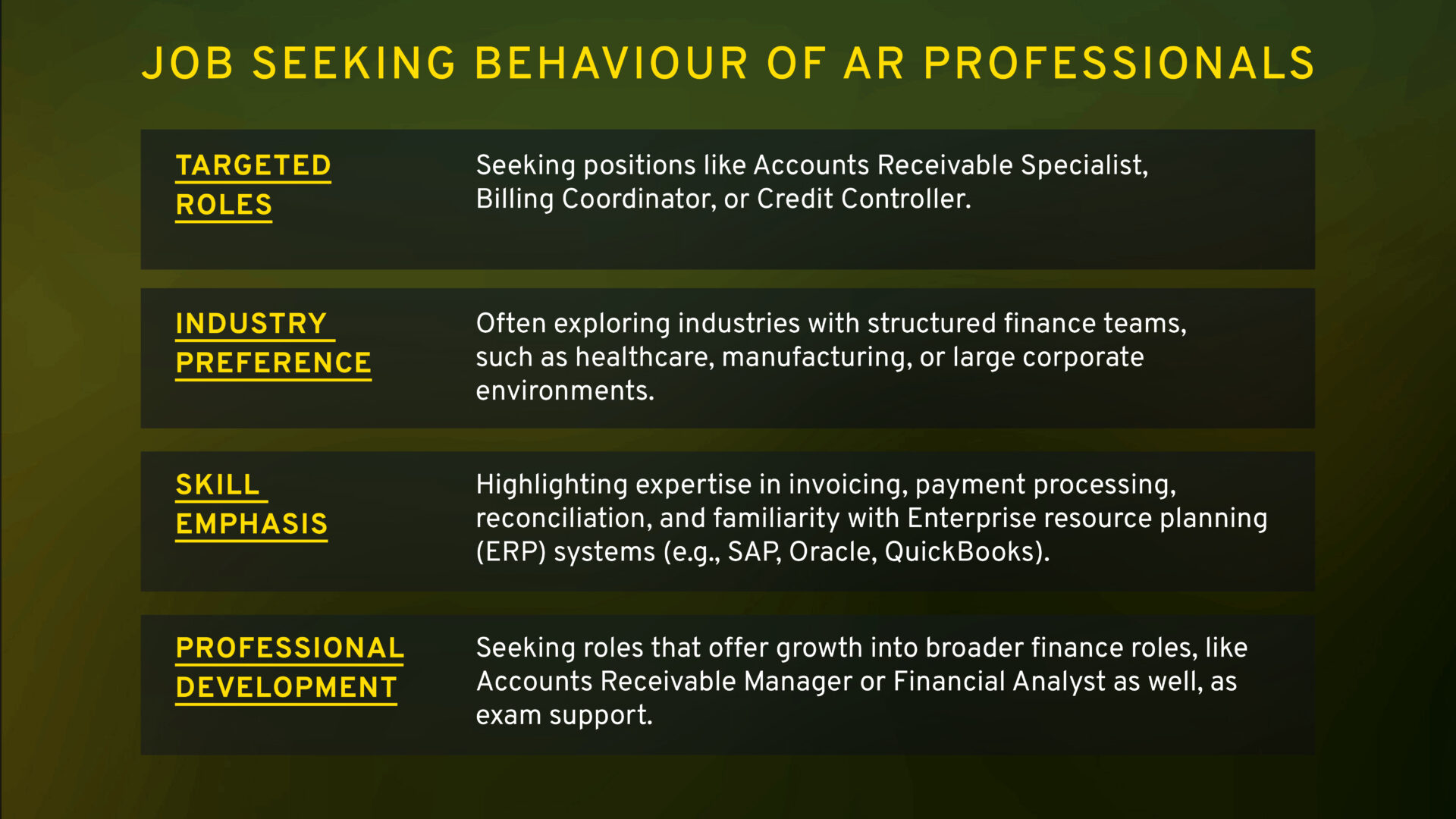 An Accounts Receivable professional’s job-seeking behaviour typically focuses on roles where they can apply their skills in managing incoming payments, maintaining financial records, and ensuring timely collection of outstanding invoices. Key aspects of their job search include: