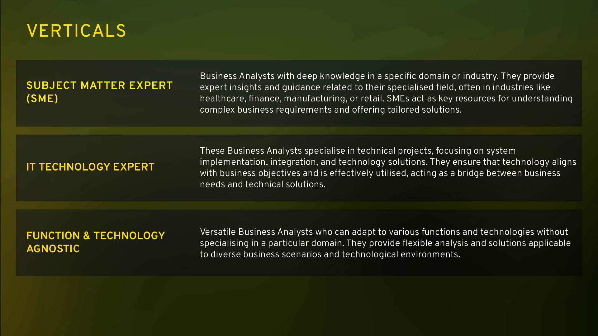 For Business Analyst professionals, verticals can be defined based on specialisation, industry focus, and the types of projects they work on. Defining these verticals allows Business Analysts to align their job search with roles that match their expertise and career aspirations. It also provides a clear framework for career development, particularly for those interested in diversifying across verticals. At Barden, we define the following key verticals: