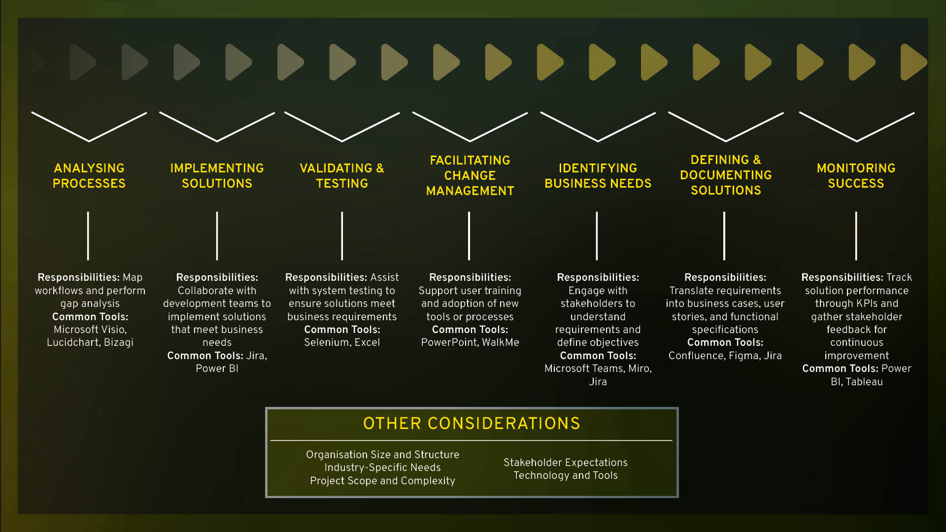 Business Analysts handle a broad range of activities across various stages. Below is an overview of their key responsibilities and the common tools used at each stage: