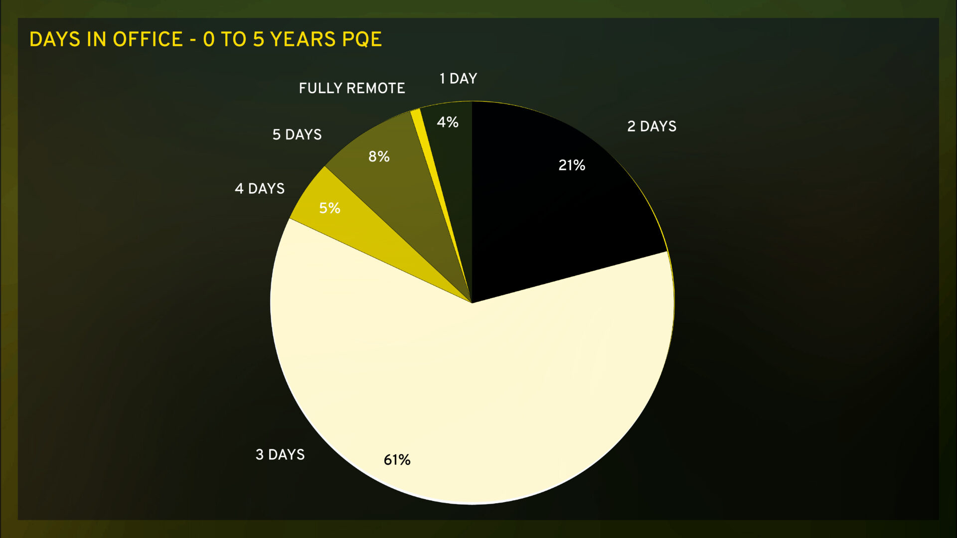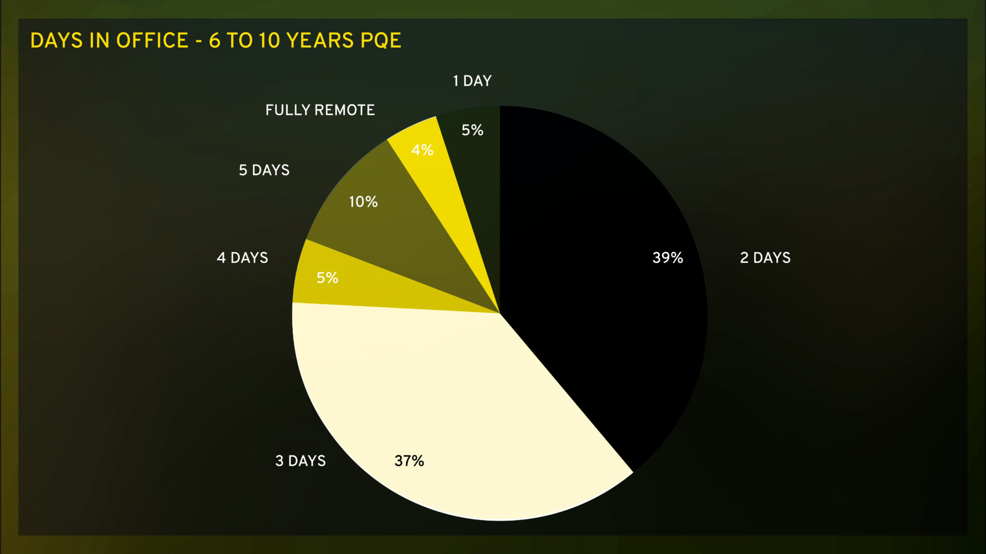 The increased flexibility in hybrid policies for the 6–10 years PQE cohort is also unsurprising, given the roles are more autonomous and less reliant on daily oversight, making remote or hybrid work more feasible.