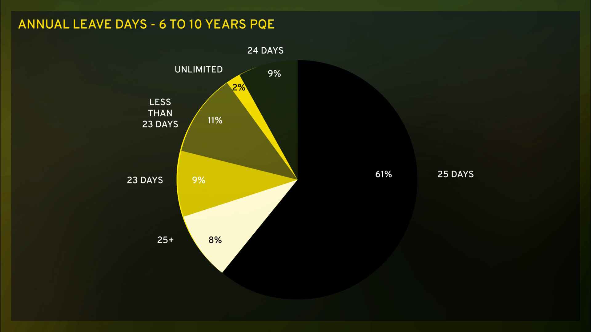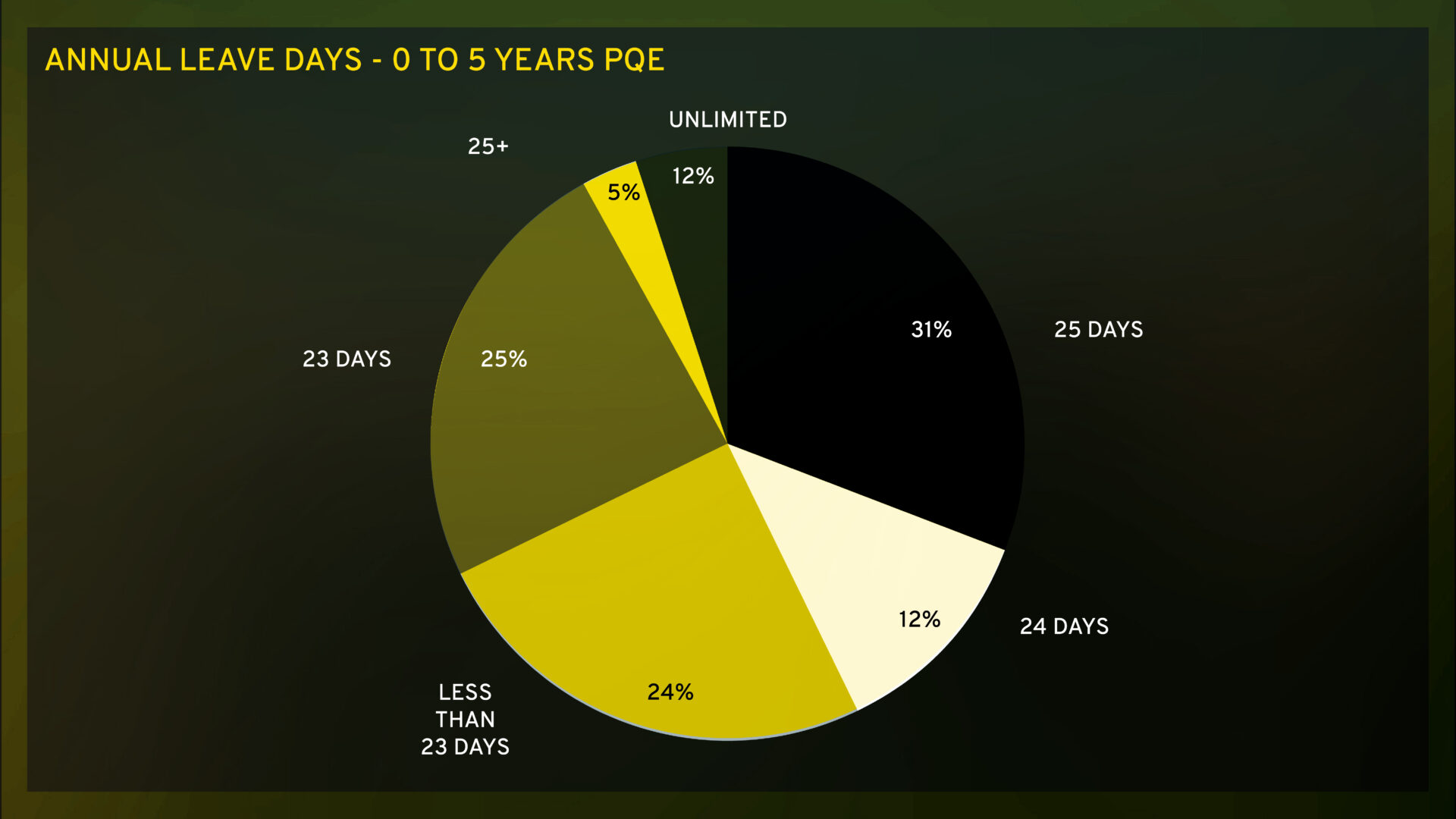 An annual leave policy of 25 days per annum appears to be the most common policy within the accounting profession as per the above (61% of instances). Offering competitive leave policies acts as a strong incentive for attracting new talent and helps retain existing talent.