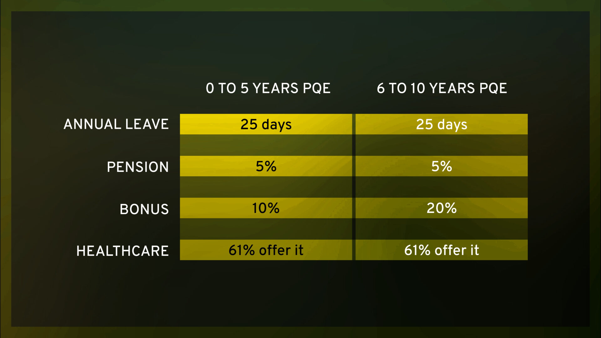 Using the same population sample as for the WFH data above, below is an outline of the common benefits seen at both the recently qualified level and senior qualified levels.