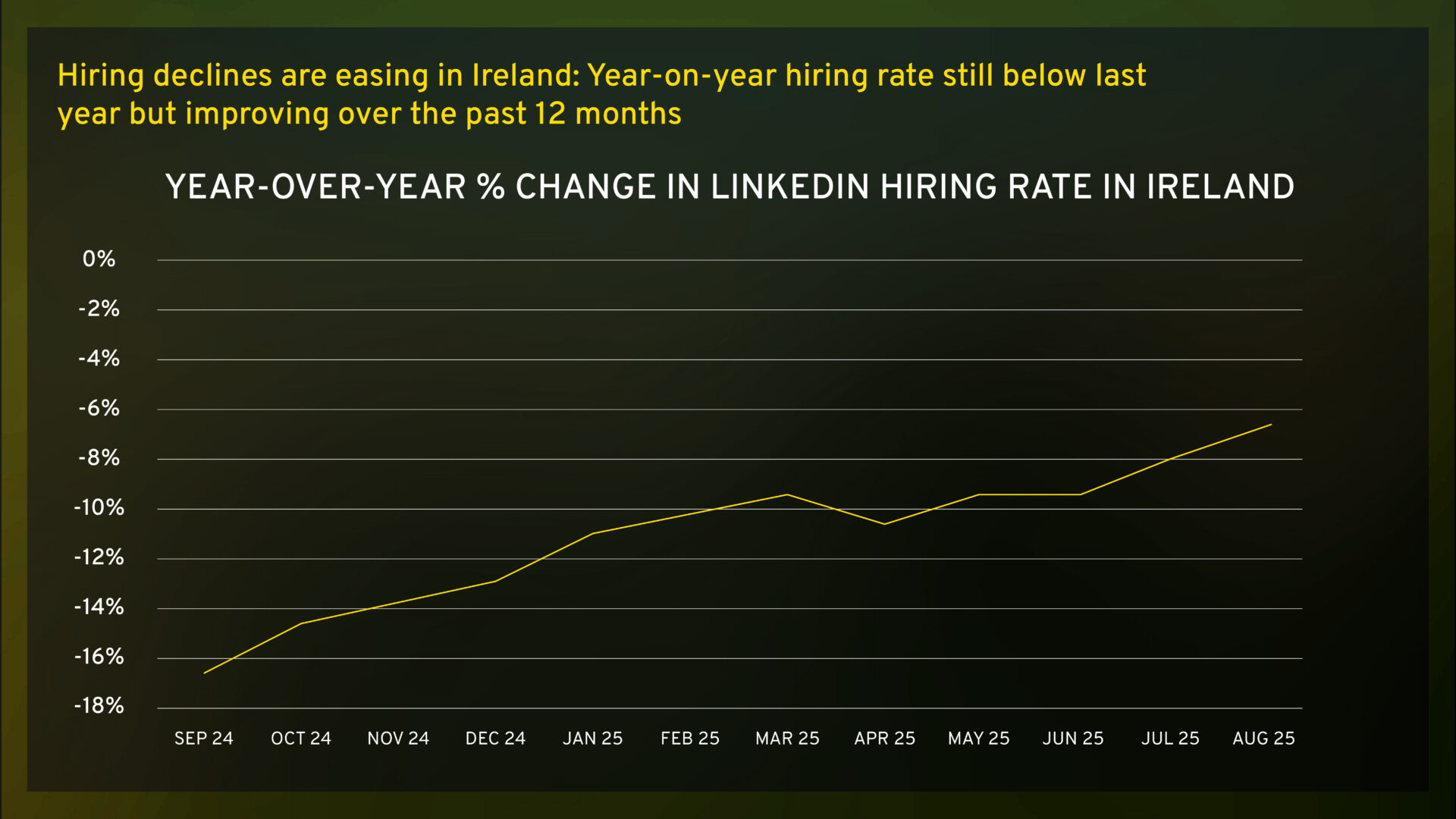 Online job posts for Q3 2025 are 16% lower than Q3 2024, however, LinkedIn data shows that the despite the decline in job postings, the rate of decline in Ireland is easing as outlined in the graph below.