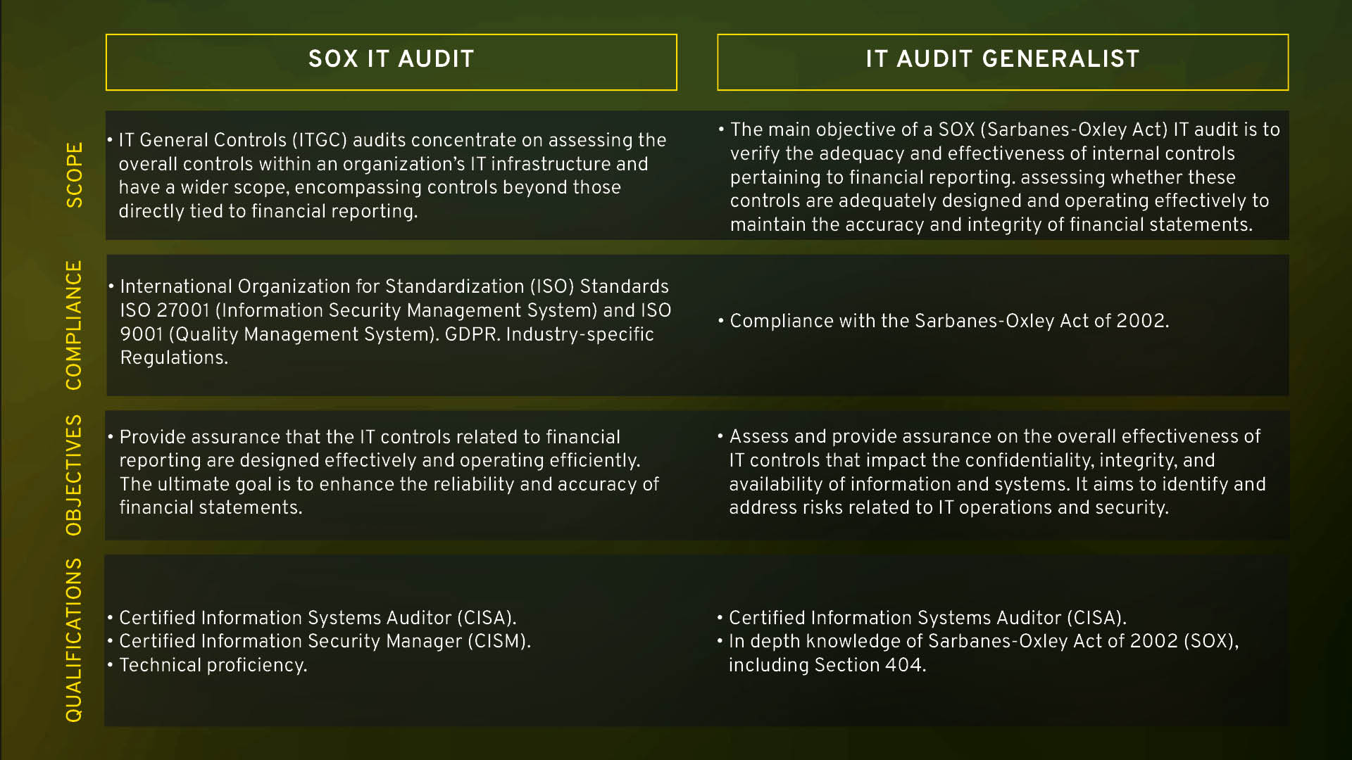 SOX IT audit and IT General Controls audit both focus on assessing and ensuring the effectiveness and reliability of information technology systems within an organization, however, some fundamental differences exist across both verticals including scope, compliance requirements, objectives and the skill set of those involved. These are outlined below:
