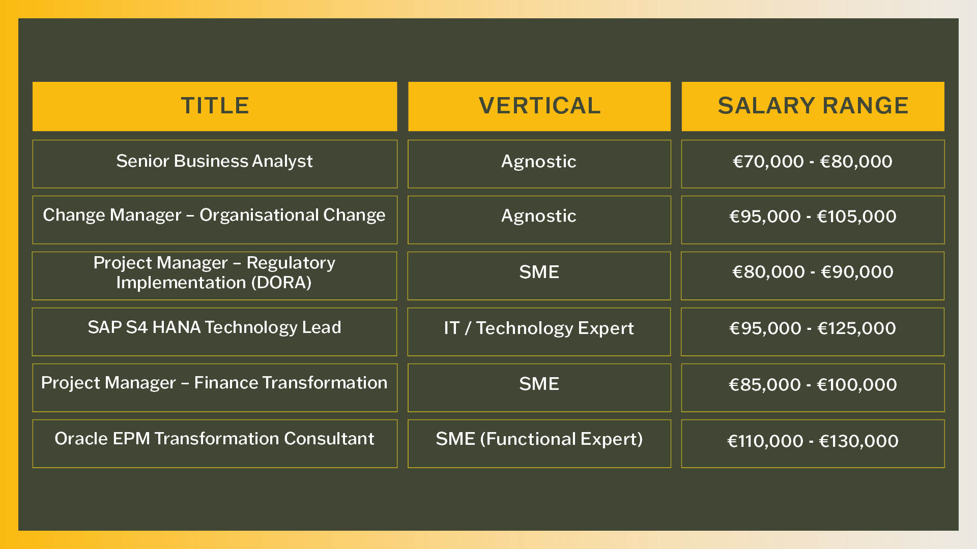 - Technology or SME expertise: A project requiring specialised skills in areas such as regulatory change, system and technology or specific industry expertise can contribute to higher salaries.