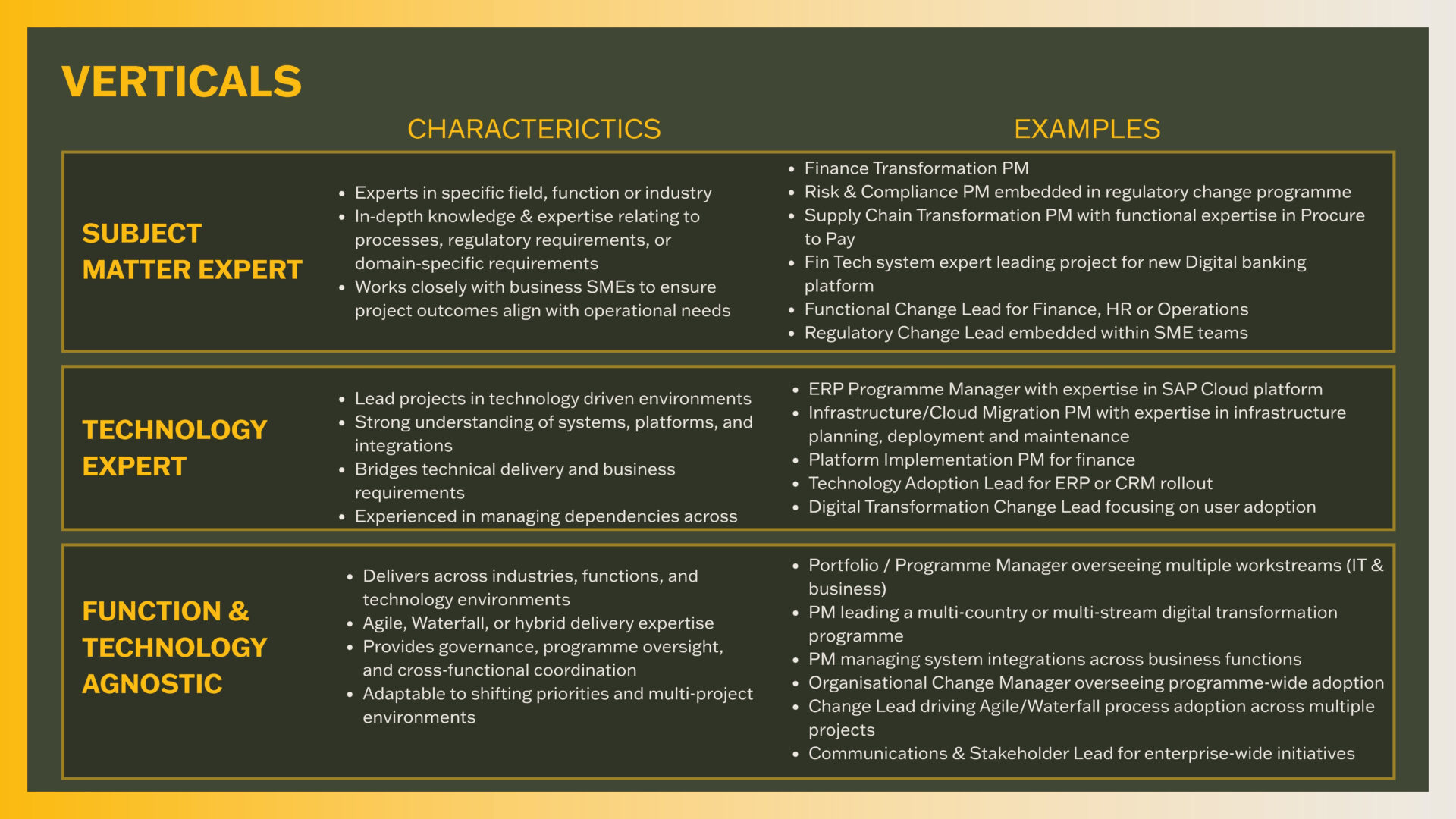 The verticals definition also enables Project and Change professionals to better articulate their own profile; defining their strengths as they relate to, for example, deep functional knowledge (SME), technical delivery expertise (Technology Expert) or broad programme leadership (Function & Technology Agnostic) across diverse environments.