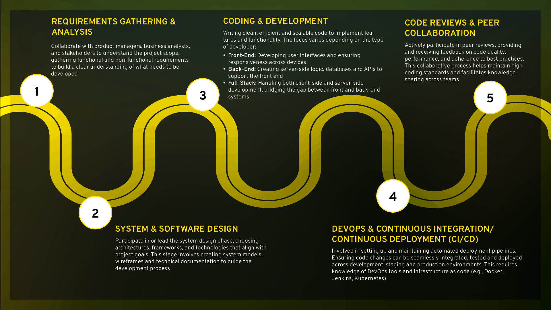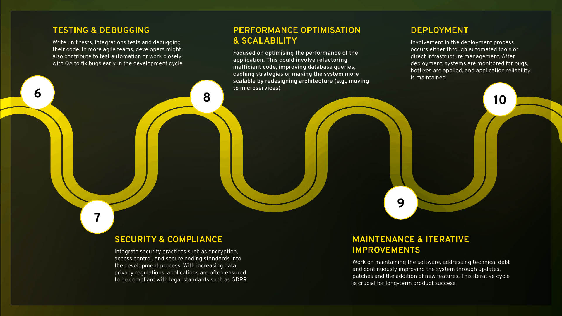 It’s important to recognise the balance of activities in a software developer’s role. The continuum below highlights the range of tasks in the software development lifecycle. Understanding this balance highlights the importance of context when evaluating roles, as not all developers engage in every step.