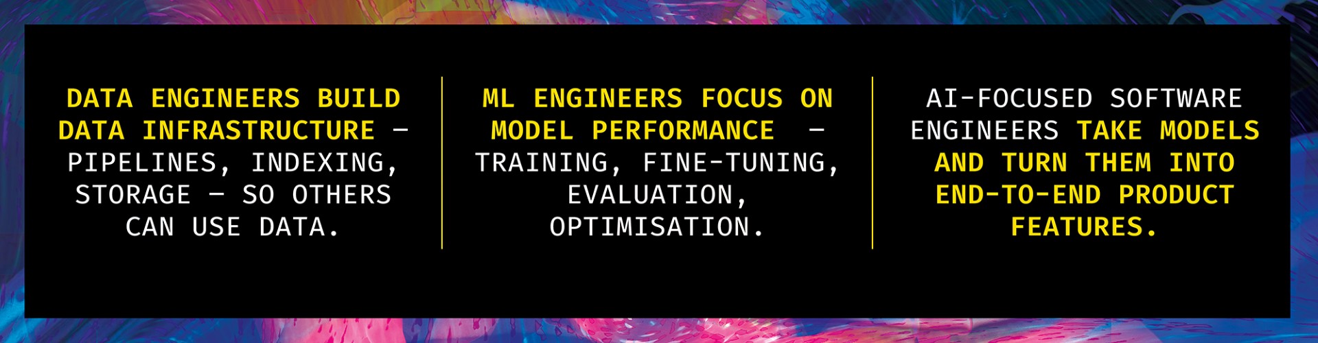 This is where titles often blur. The day-to-day reality of a data engineer, an ML engineer, and an AI-focused software engineer can look adjacent, but the goals are very different.