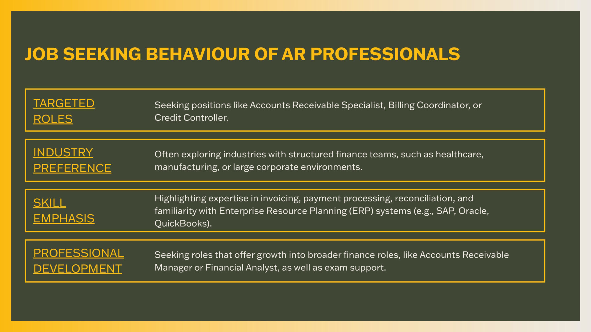 Accounts Receivable professionals tend to show two clear job-seeking behaviours. Some are highly driven and focused on career progression, looking for roles that offer a step toward management or a move into broader accounting functions. Others are more influenced by practical factors such as salary, industry, and whether the business operates in a B2B or B2C environment, valuing stability and fit over rapid advancement.