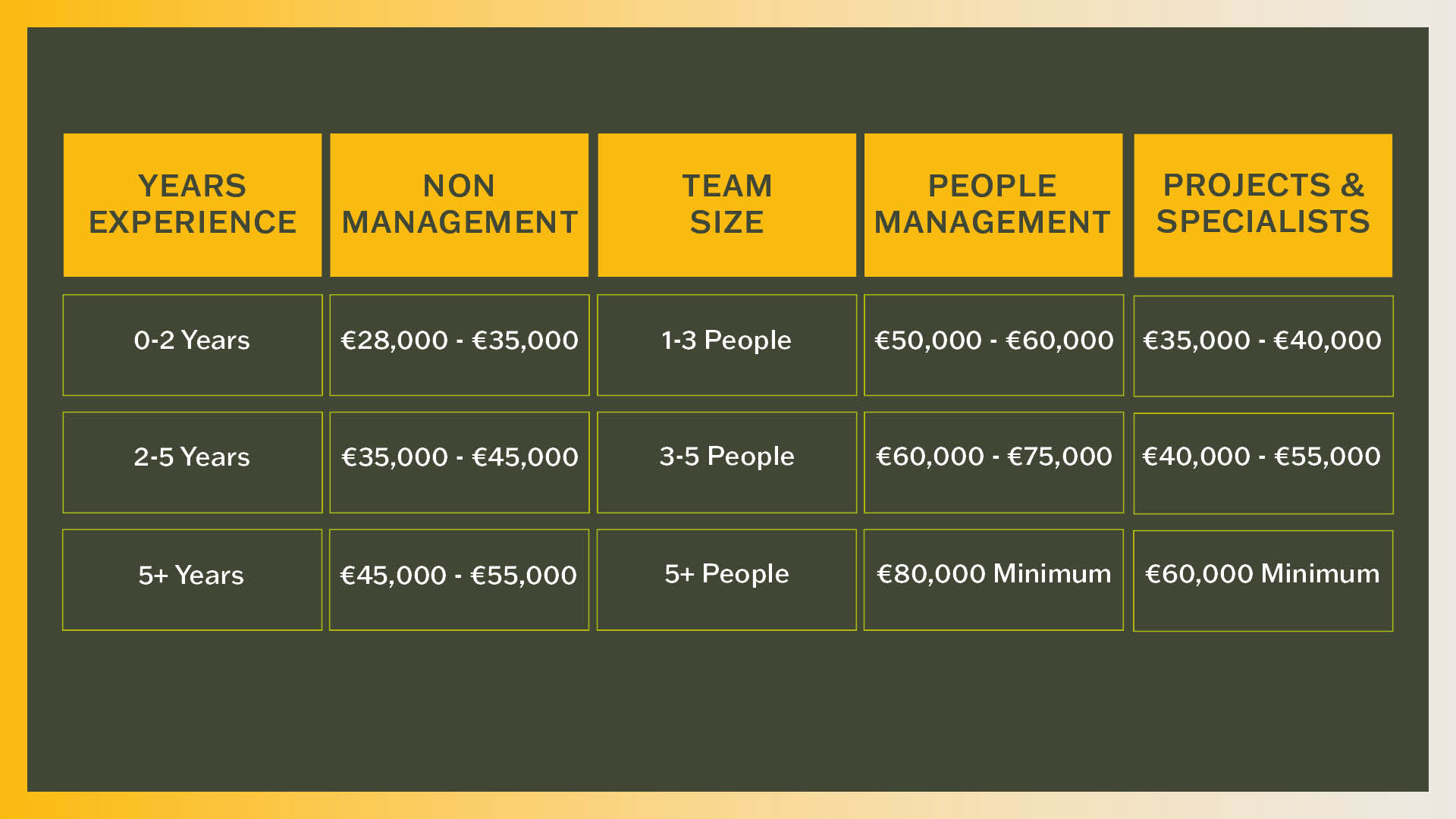 You can expect a 10-15% reduction on the above numbers, when considering appointments outside of Leinster. For bespoke advice please contact our team; phonsie.irwin@barden.ie (Leinster) or tara.higgins@barden.ie (Munster).