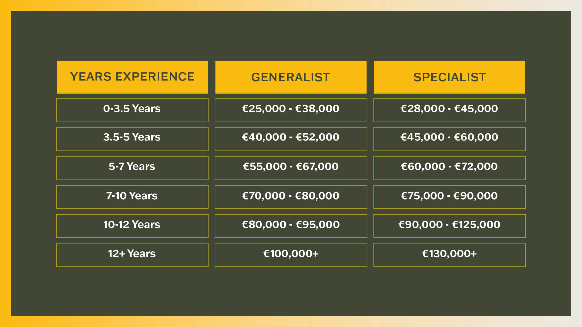 *These are Dublin-only numbers. For roles outside Dublin, you would typically apply a 10% reduction on base with an additional variation of around 2.5% depending on the specific location. For bespoke advice please contact our team; niall.okeeffe@barden.ie (Leinster) or conor.murphy@barden.ie (Munster).