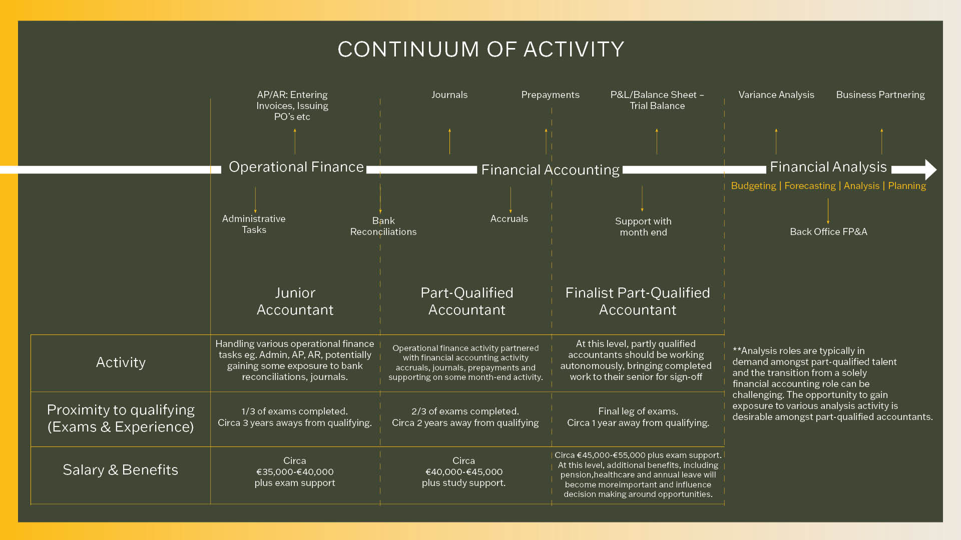 Below is a simple continuum of the activity you would expect to see in any finance team/role from a part-qualified perspective. This continuum is deliberately focused on financial accounting activity as most part qualified accountants train and spend their time here. We have also mapped various activities in the continuum and how titles relate to salary and proximity to exam completion, all of which will paint a picture of the natural order and flow of a part-qualified accountants’ career. This continuum ignores things like finance transformation, statutory reporting, tax etc.…let’s keep it simple for now.