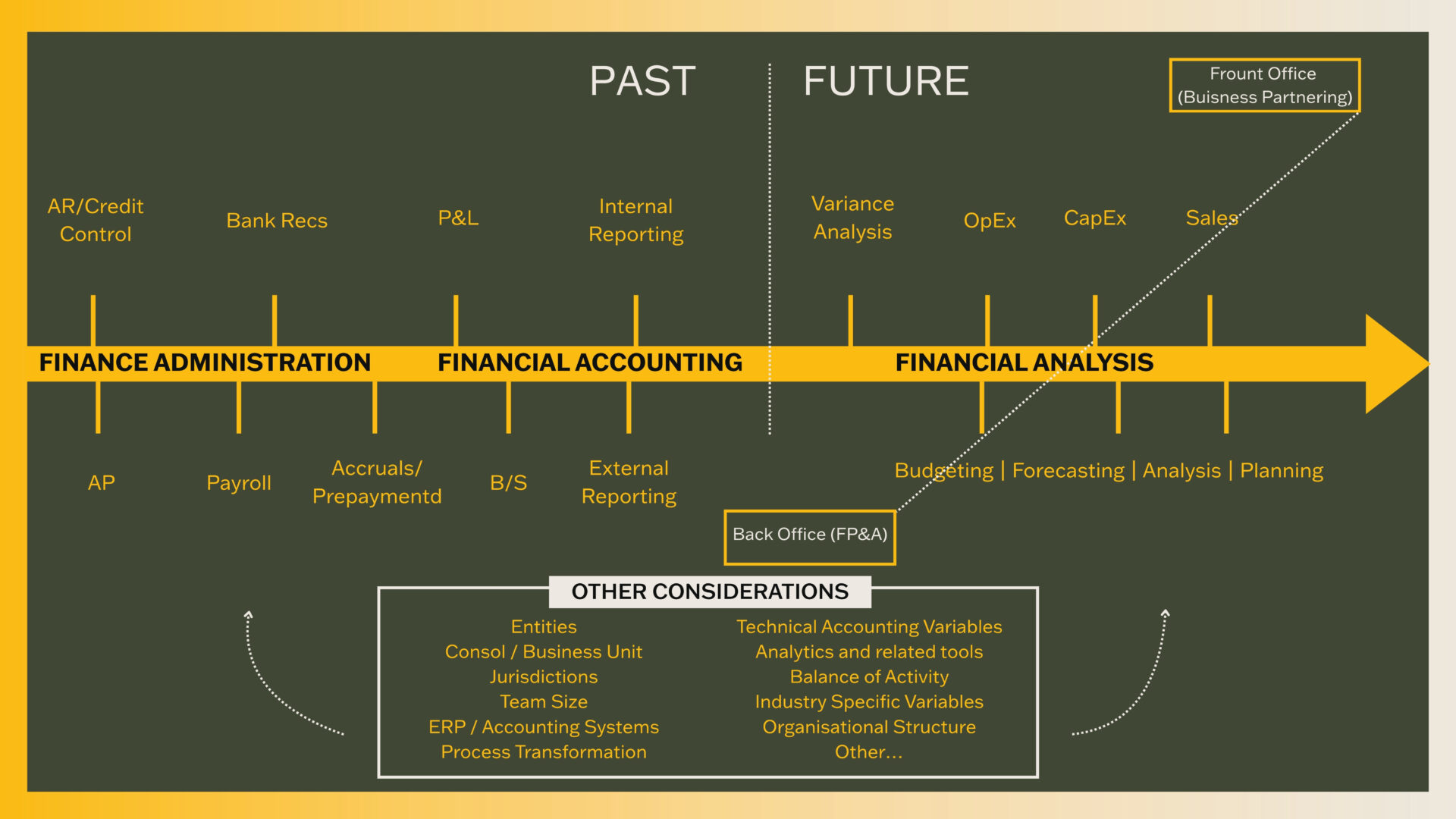 This is important. But a little tricky. Below is a simple continuum of the activity you will expect to see in any finance team/role. It ignores things like finance transformation, stat reporting, and tax…let’s keep it simple for now.